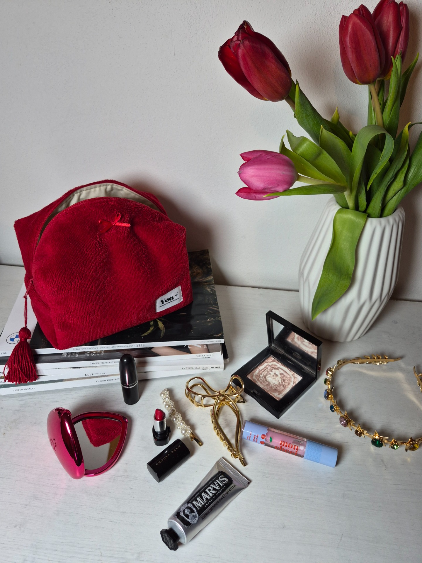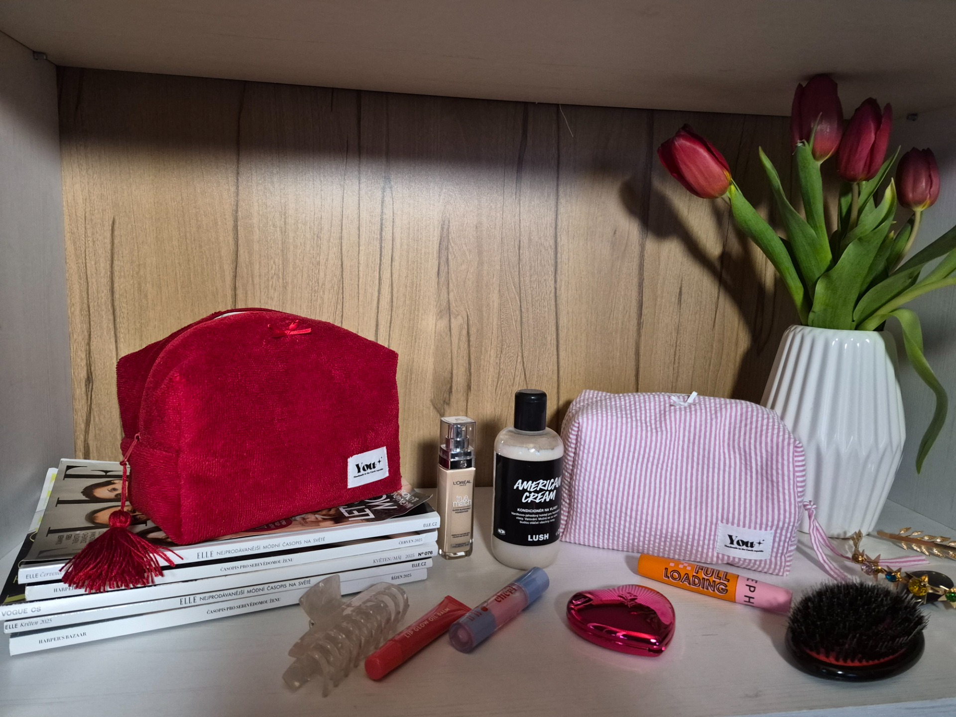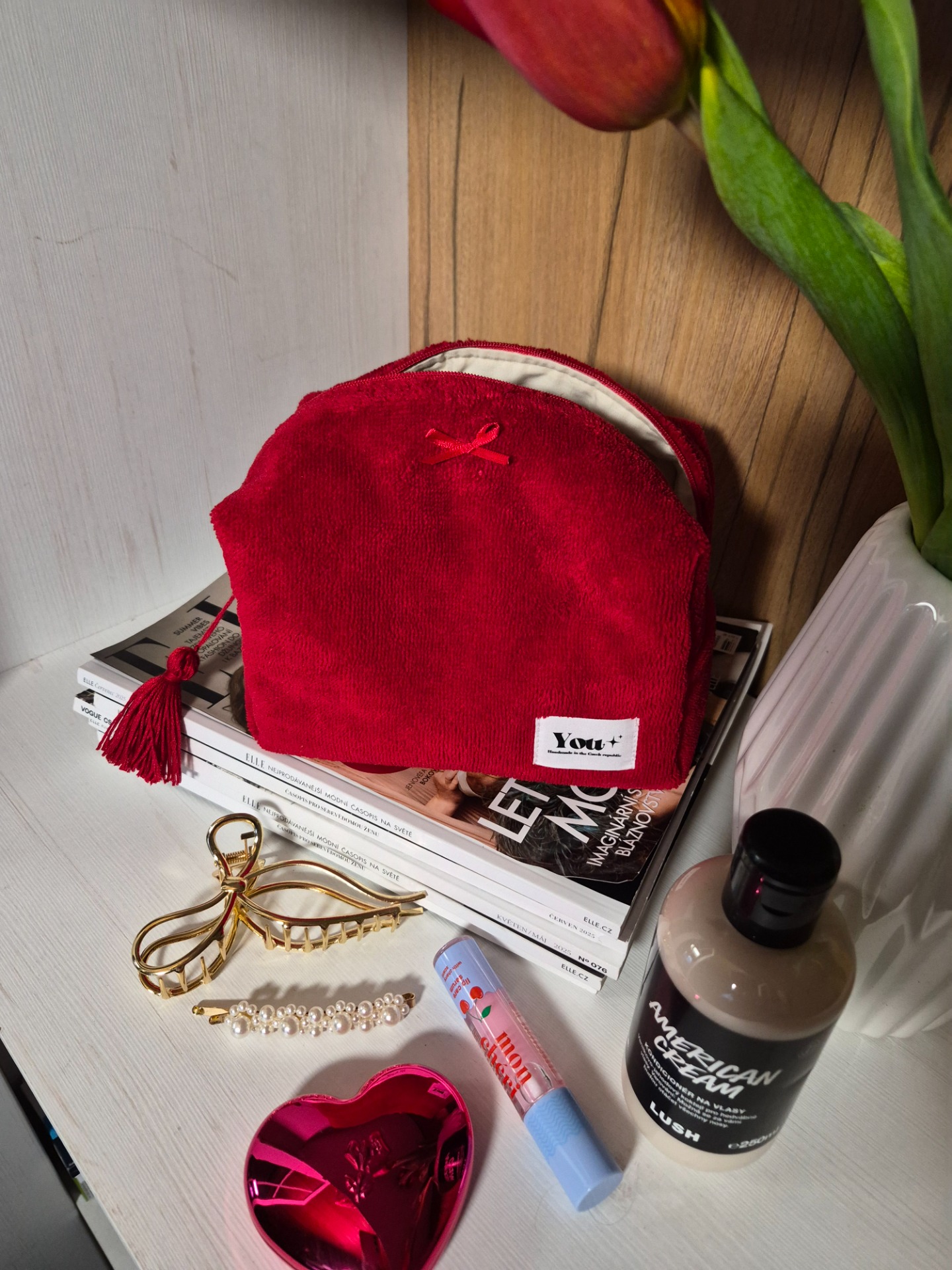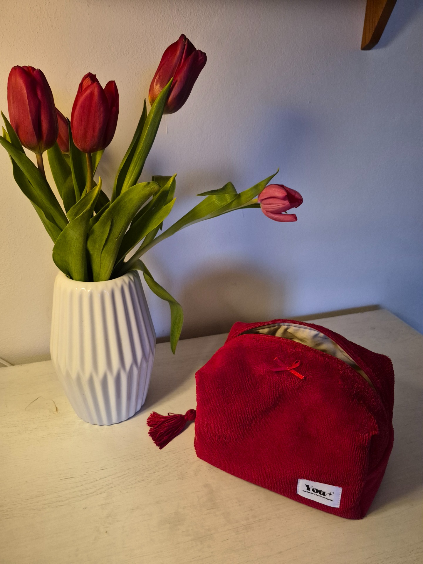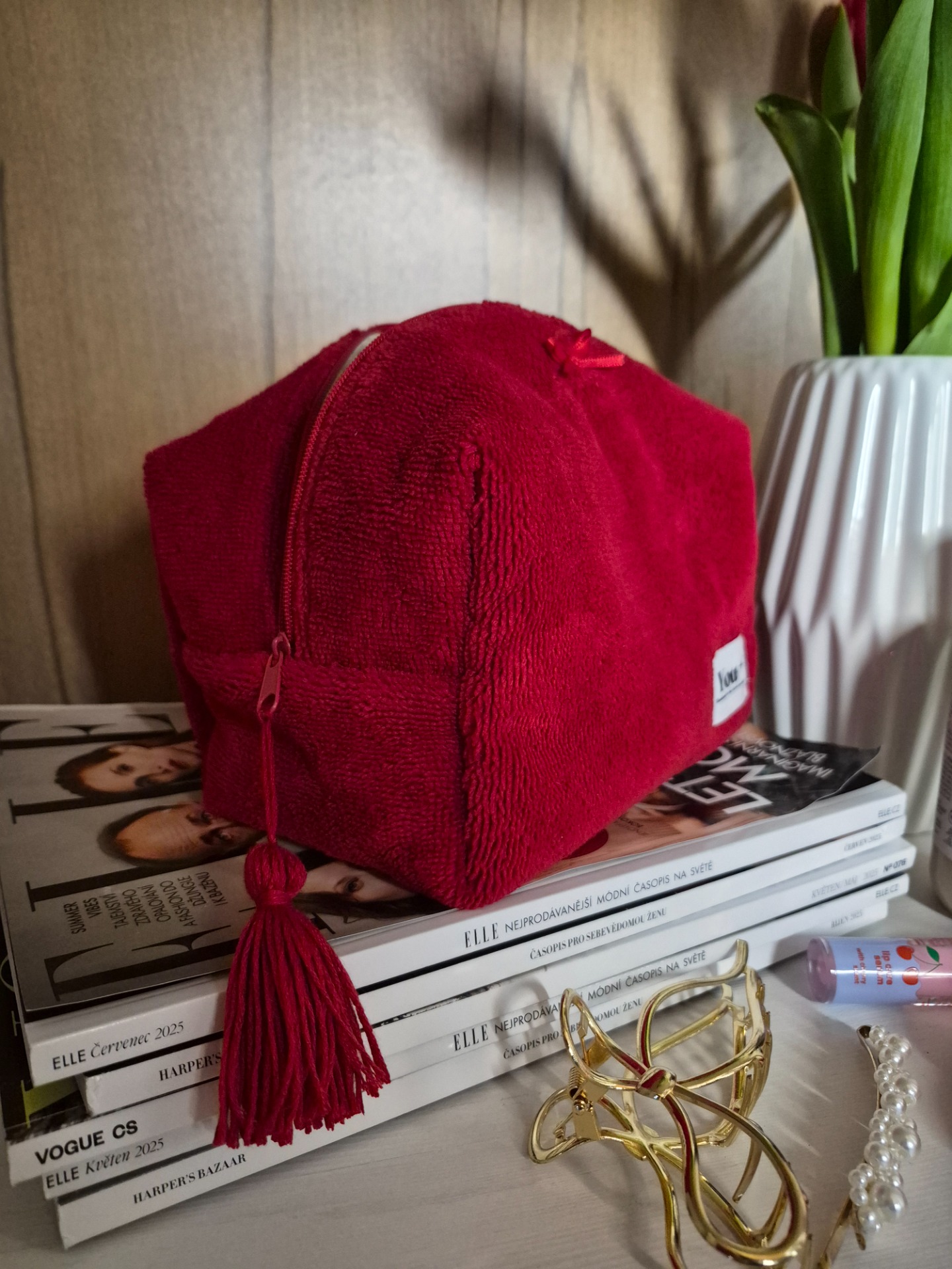 Vášnivě červené bambusové froté s béžovou podšívkou a ručne vyráběnýmm střapcem.