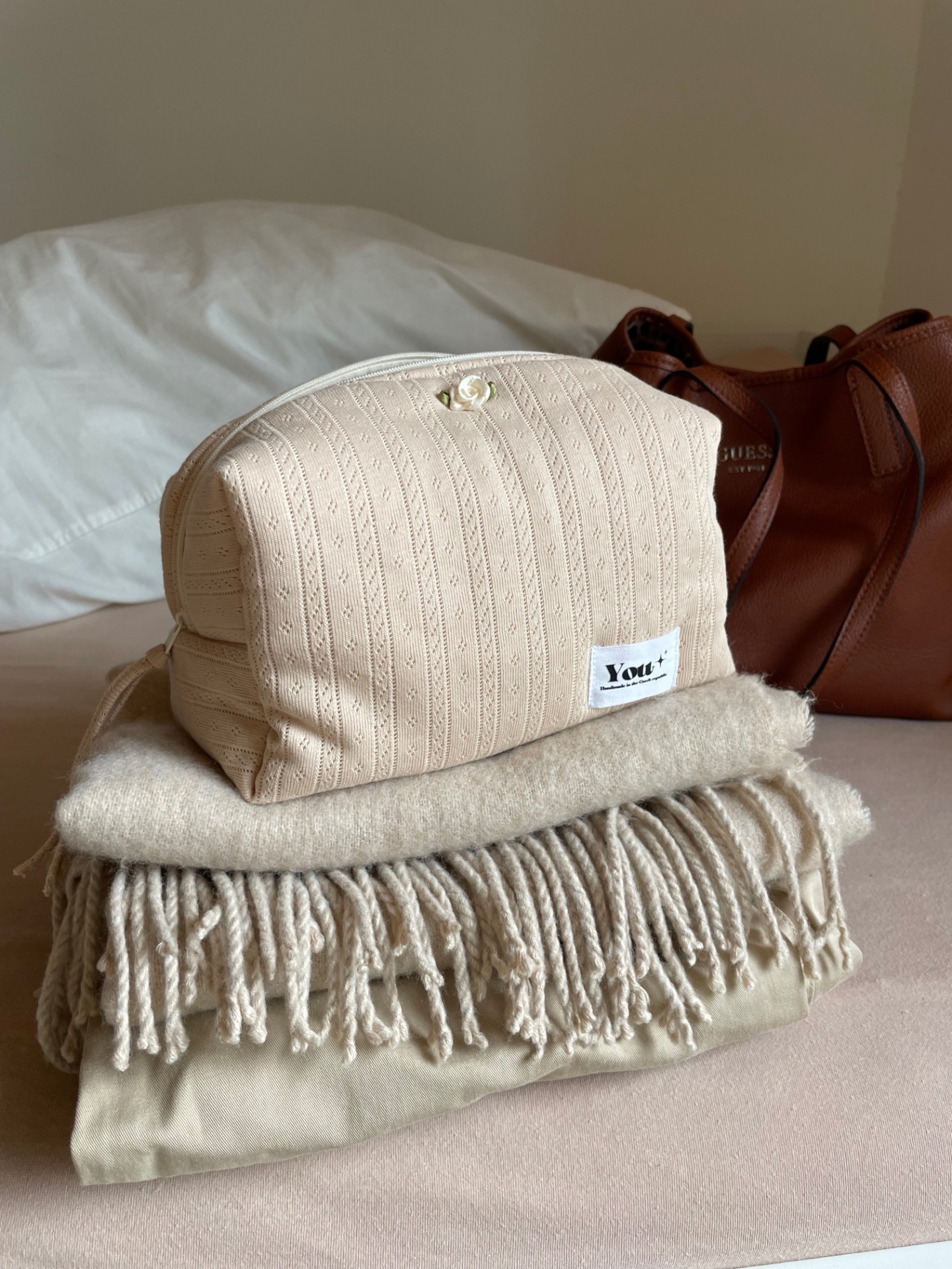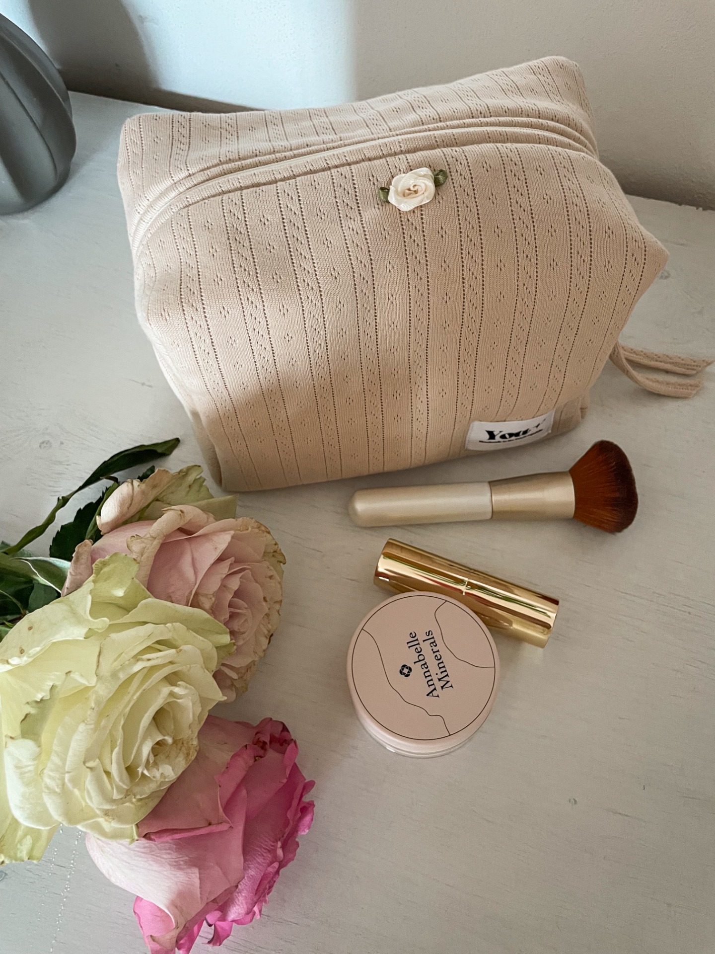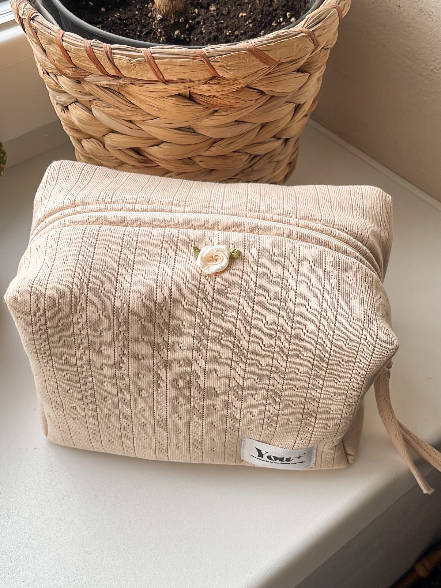 Jemná, elegantní a stylová s dotekem ženskosti v podobě béžové růžičky. Taštička nese jméno Martina podle své první majitelky, aby tak dělala radost i dalším ženám a slečnám. Taštička je ušitá z béžového žebrovaného úpletu pointelle a vnitřek tvoří krémová, pevná bavlna.
